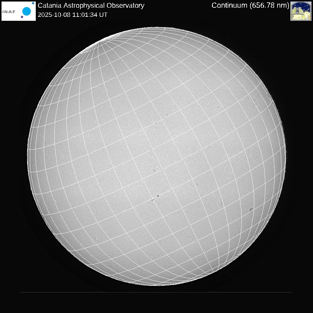 The image shows the latest continuum image of the Sun acquired at INAF - Catania Astrophysical Observatory with a quality index equal to 1 (1 =good, 3 = bad). The spacing of meridians and parallels is 10 degrees.
