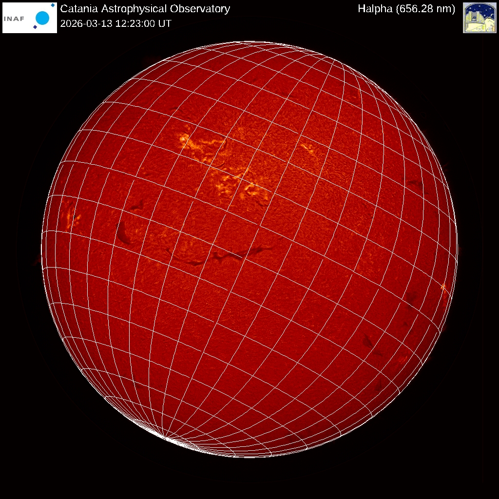 The image shows the latest Hα image of the Sun acquired at INAF - Catania Astrophysical Observatory with a quality index equal to 1 (1 =good, 3 = bad). The spacing of meridians and parallels is 10 degrees.