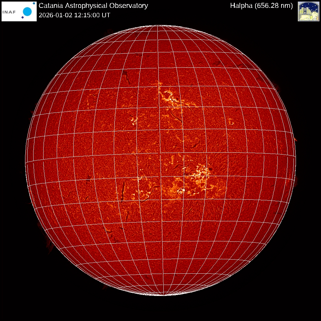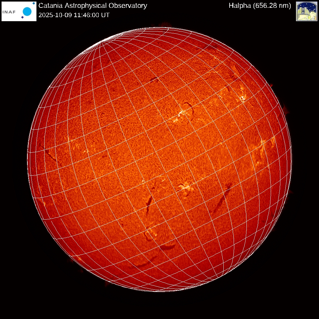 The image shows the latest full disc image of the Sun in the center of the Hα line (656.28 nm ± 0.25 nm) acquired at INAF - Catania Astrophysical Observatory. The raw images are recorded with a size of 2200 x 2200 pixels and a digital resolution of 16 bit. The display is refreshed every minute. The spacing of meridians and parallels is 10 degrees.