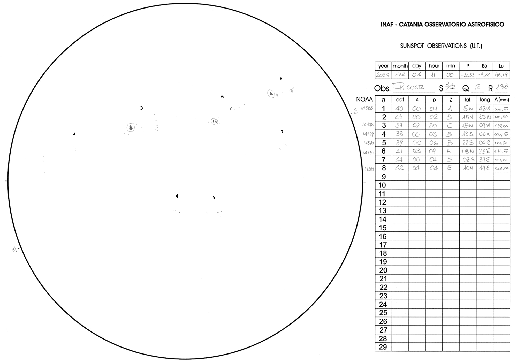 Daily drawings of sunspots groups and pores are maken between 8:00 and 14:00 local time (CET/CEST). When the weather is cloudy or ash falls due to the Etna eruptions the drawings are not provided.